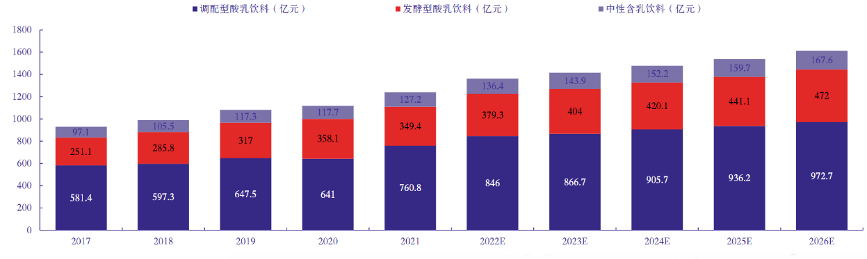 调配型含乳饮料代表产品主要为娃哈哈AD钙奶、旺仔牛奶及营养快线等;中性含乳饮料主要有李子园甜牛奶、燕塘甜牛奶;蒙牛优益C、养乐多及均瑶健康味动力等,是发酵型含乳饮料的代表。