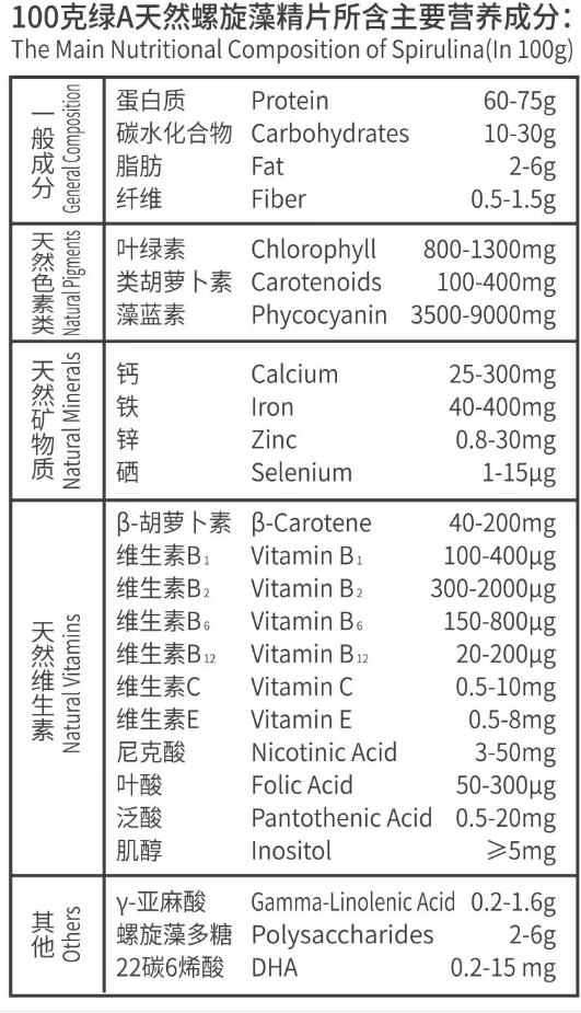 螺旋藻具有高蛋白、低脂肪、低糖类的特点,并富含多种维生素,矿物质,微量元素等生理活性物质,是一种理想的高蛋白低热量食品,具有极高的营养价值,螺旋藻也是维生素的天然宝库,其中β一胡萝卜素含量是所有天然食物之冠,约是胡萝卜的10倍维生素B含量比动物肝脏高出3.5倍,螺旋藻含有钙,铁、锌、硒、钾、镁、碘等多种有益身体的矿物质,其中有机铁的含量是菠菜的23倍,是铁含量最丰富的食物;钙含量是牛奶的10倍。螺旋藻的主要营养成分见下图。