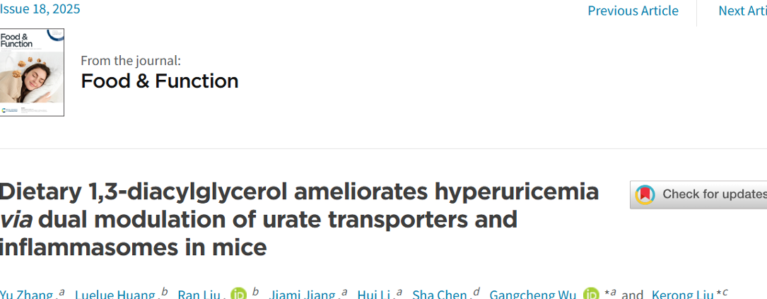 今年8月,江南大学在Food & Function上发表的一篇研究发现,甘油二酯油能显著改善高尿酸血症,具有健康干预潜力。