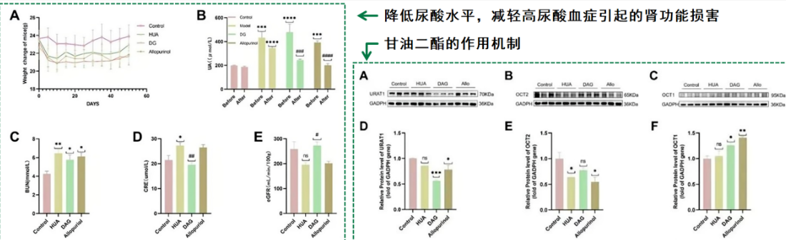 研究发现,甘油二酯可有效降低尿酸水平,减轻高尿酸血症引起的肾功能损害。从机制上看,甘油二酯对肾脏尿酸转运系统具有双重调控作用:一方面显著抑制尿酸重吸收相关蛋白URAT1的表达,另一方面上调促进尿酸分泌的转运蛋白OCT2的表达,从而增强尿酸的主动分泌。