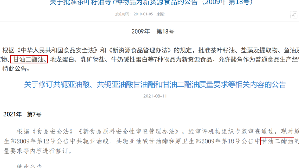 在我国,甘油二酯油的法规进程逐步推进:2009年,原卫生部批准其作为新资源食品,要求产品以花生油、大豆油、菜籽油、玉米油为原料生产甘油二酯油,并且产品中甘油二酯含量≥40%、甘油三酯含量≤58%。2021年7月,国家卫健委在《新食品原料终止审查目录》中进一步扩大了可用原料范围,允许以橄榄油、亚麻籽油、油茶籽油、大豆油等多种常见植物油为原料生产甘油二酯油,相比此前审批的原料来源更为广泛。