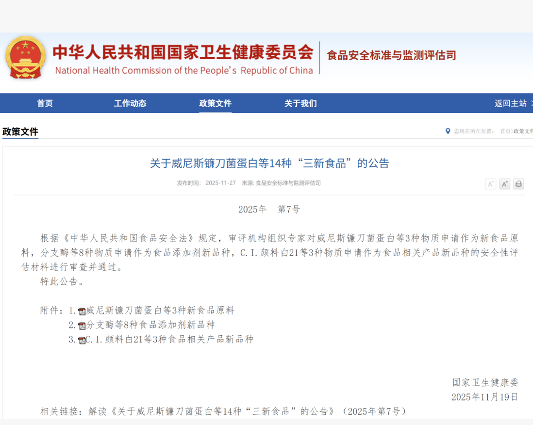 2)2025年11月24日,国家卫生健康委员会政务服务平台发布索马甜(发酵法)、(6S)-5-甲基四氢叶酸,单钠盐作为食品添加剂新品种的受理情况公告。(来源:国家卫生健康委员会政务服务平台)