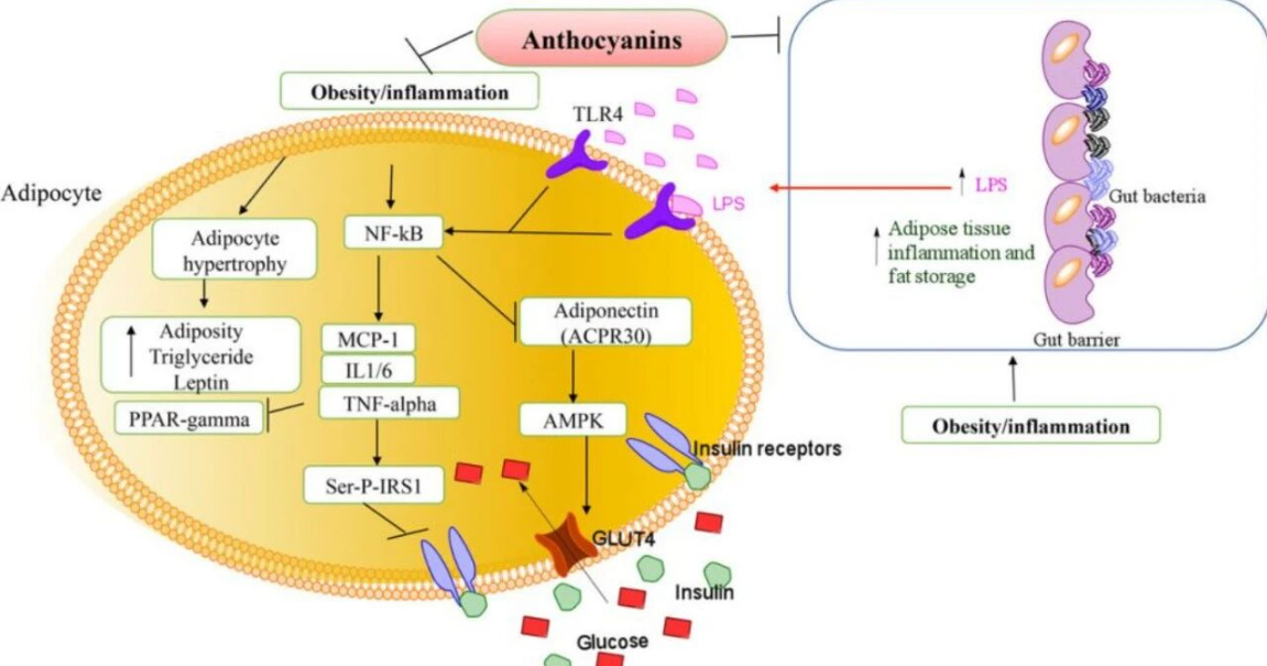 花青素的发酵有助于短链脂肪酸的产生,主要是乳酸、乙酸、丙酸和丁酸。这些脂肪酸不仅为肠道细胞提供能量,还能通过调节细菌毒力基因表达和降低结肠中管腔pH值来抑制肠道病原体如沙门氏菌、大肠杆菌和李斯特菌的入侵。短链脂肪酸在肠道生理事件中发挥着重要作用,如获取能量、调节pH、参与肠脑轴和保护肠道屏障功能。花青素对肥胖相关炎症和肠道菌群变化的保护(Molecular Nutrition Food Research)